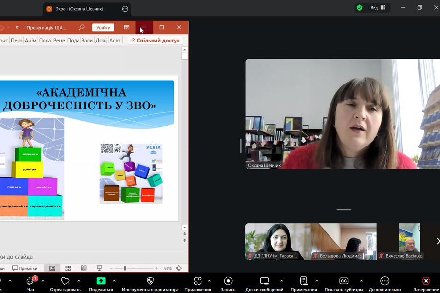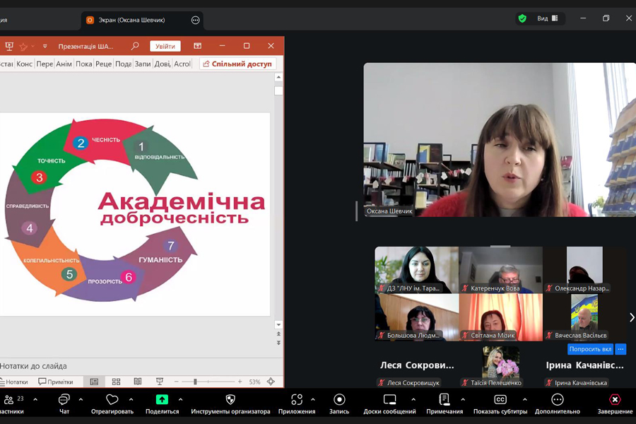26 грудня для здобувачів першого року навчання другого (магістерського) рівня вищої освіти спеціальності І10 «Соціальна робота та консультування» за освітньою програмою «Соціальна робота та консультування. Психосоціальні послуги» відбулася інформаційна зустріч з провідною бібліотекаркою ДЗ «Луганський національний університет імені Тараса Шевченка» Оксаною Шевчик. Тема заходу – «Академічна доброчесність у закладах вищої освіти».