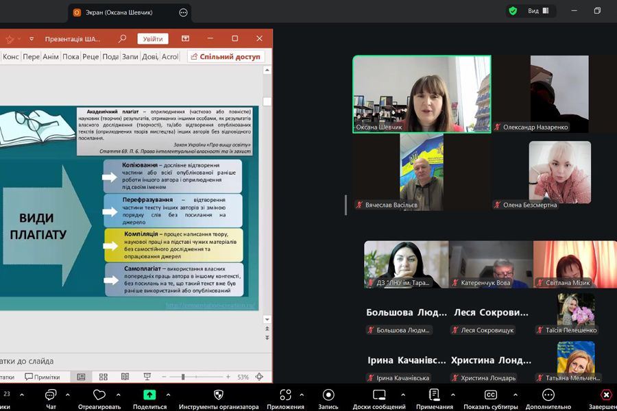 Під час зустрічі лекторка ознайомила магістрантів з основними принципами академічної доброчесності, наголосила на важливості дотримання етичних норм у навчальній та науково-дослідній діяльності. Окрема увага була приділена видам академічної недоброчесності, зокрема плагіату, самоплагіату, фабрикації та фальсифікації даних, списуванню, недобросовісному рецензуванню та хабарництву.