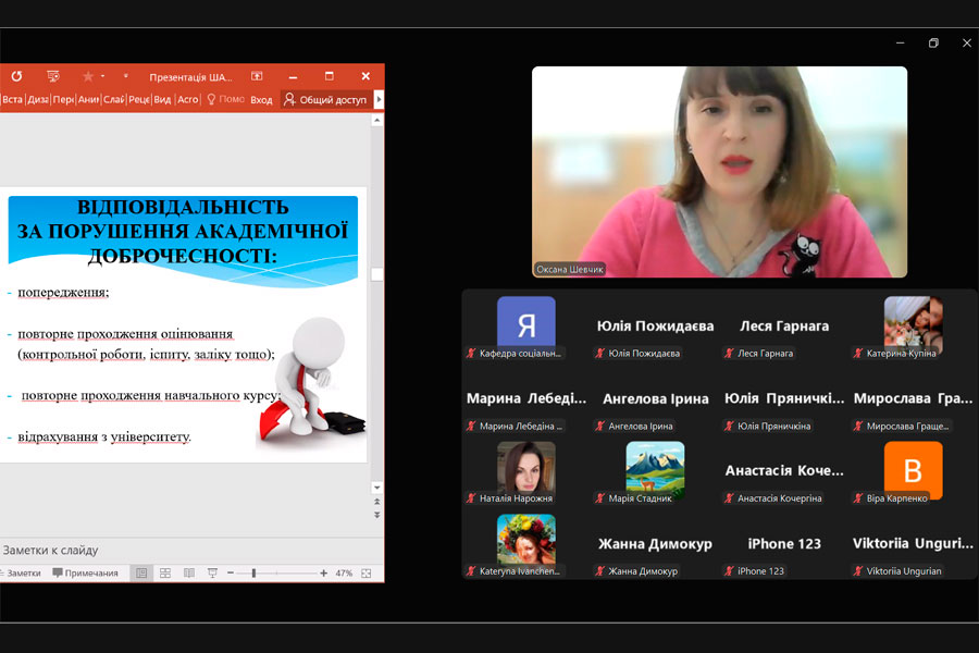 07 листопада 2024 року для здобувачів 1 року навчання другого (магістерського) рівня вищої освіти спеціальності 231 «Соціальна робота» за освітньою програмою «Соціальна робота. Соціальна педагогіка. Практична психологія» відбулася інформаційна зустріч із провідною бібліотекаркою ДЗ «Луганський національний університет імені Тараса Шевченка» Оксаною ШЕВЧИК. Тема зустрічі «Академічна доброчесність у ЗВО».