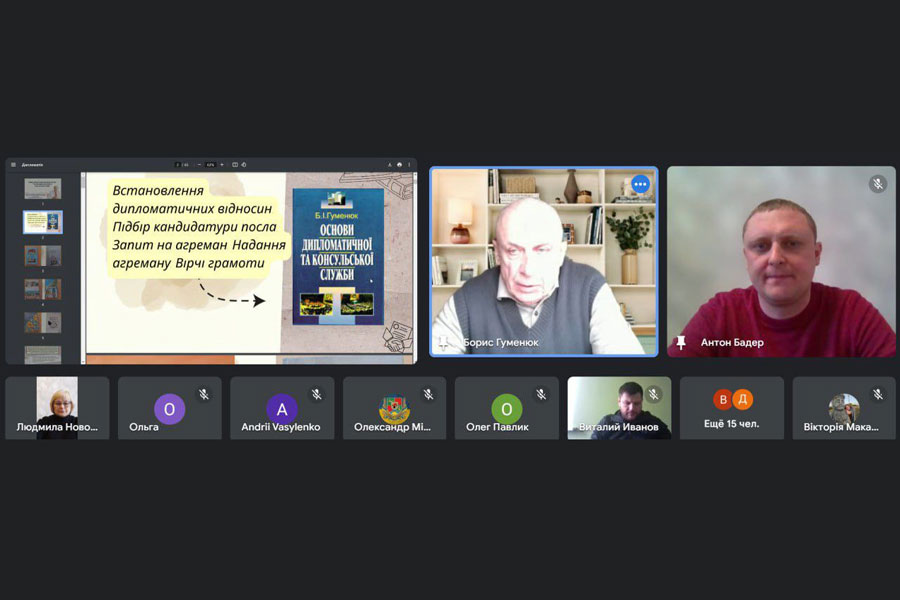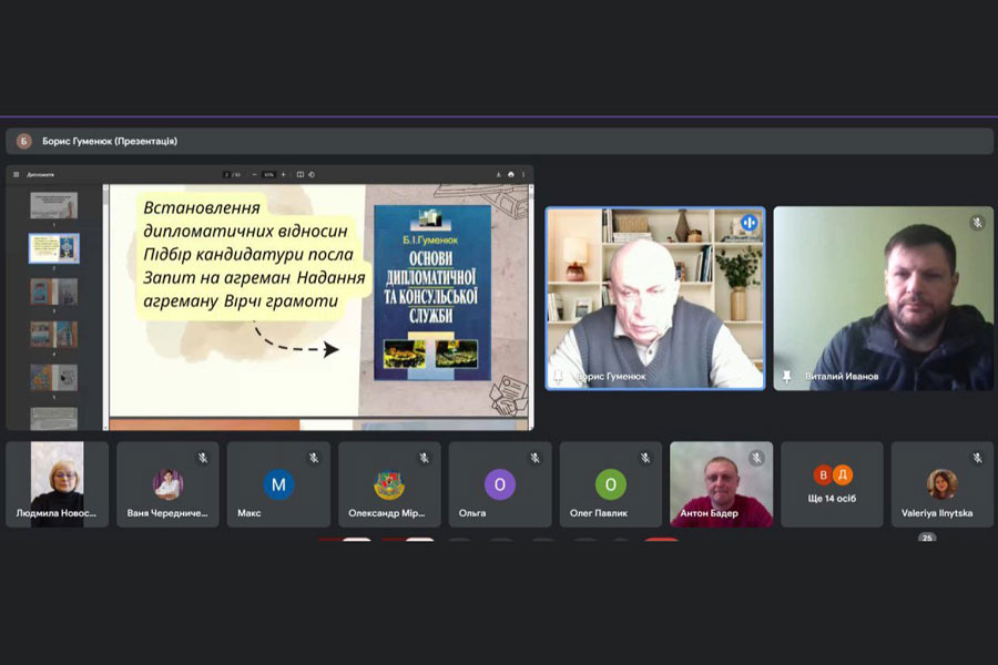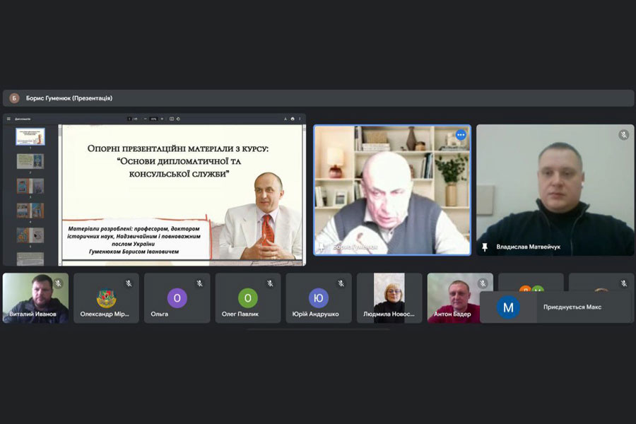 11 лютого для здобувачів напрямів підготовки «Міжнародні відносини, суспільні комунікації та регіональні студії» (першого рівня вищої освіти); «Політологія» (першого, другого та третього рівнів вищої освіти) відбулася гостьова лекція українського дипломата, доктора історичних наук, професора, завідувача кафедри історії міжнародних відносин та гуманітарних студій Українського державного університету імені М. П. Драгоманова, Надзвичайного і Повноважного Посла України за темою «Міжнародно-правова процедура становлення дипломатичних відносин між суб’єктами міжнародних відносин».
