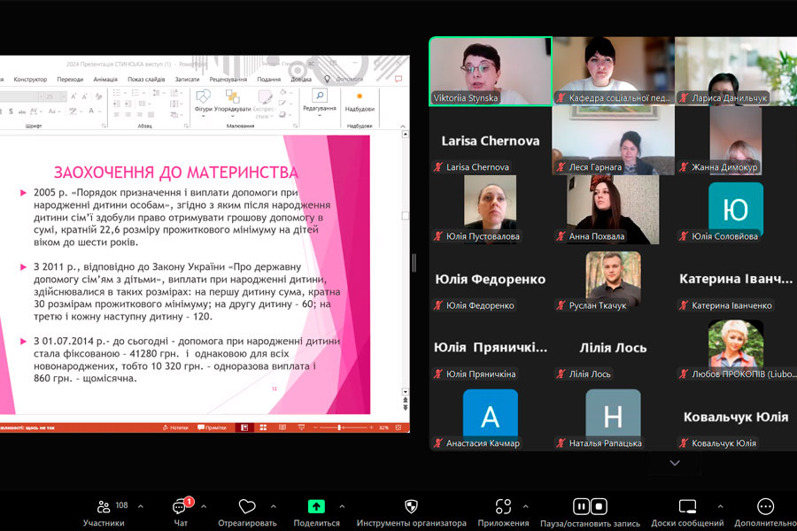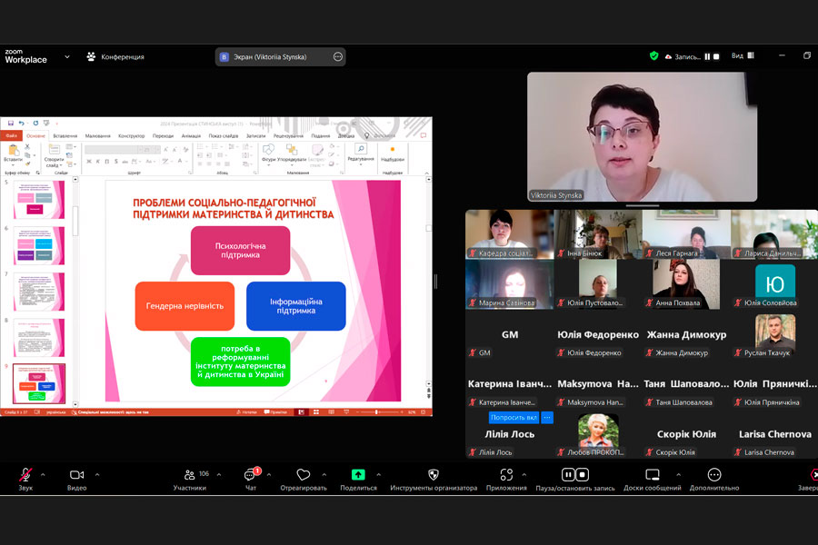 Окрім цього, Вікторія Володимирівна розкрила нормативно-правову базу з питань соціально-педагогічної підтримки материнства й дитинства в Україні; розповіла про особливості підтримки сімей з дітьми; наголосила на важливості комплексного підходу та міждисциплінарної співпраці для забезпечення ефективної допомоги; а також поділилася результатами власних досліджень у цій галузі.