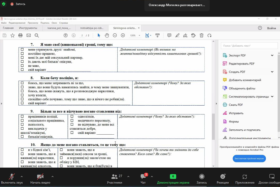 Прикладним аспектом проведеної лекції є наданий доповідачами інструмент моніторингу випадків порушення прав дитини, зокрема скринінгова анкета для соціальних працівників.