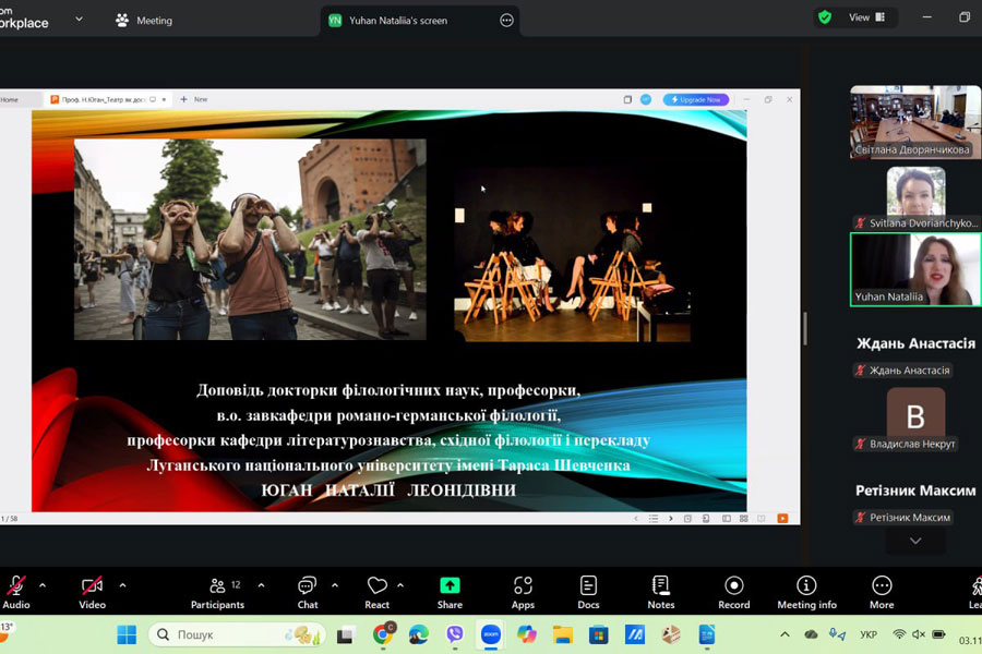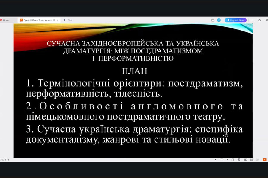 Тема лекції – «Сучасна західноєвропейська та українська драматургія: між між постдраматизмом іі перформативністю» - охоплювала основні зміни в театральному мистецтві другої половини ХХ – початку ХХІ століття. Лекторка пояснила, як театр перестає бути лише відтворенням драматичного тексту, натомість стає простором досвіду, дії, взаємодії з глядачем і тілесної присутності. Було розкрито ключові поняття: постдраматизм (Ганс-Тіс Леман); перформативність; тілесність.