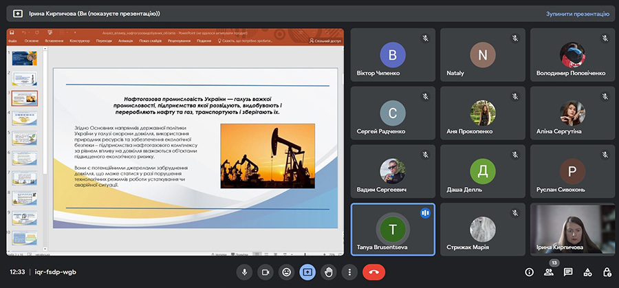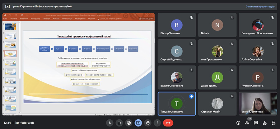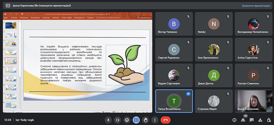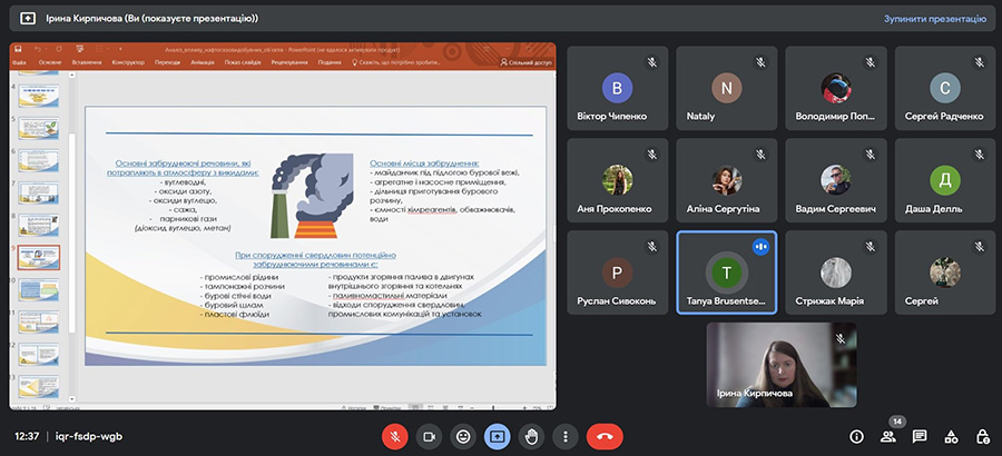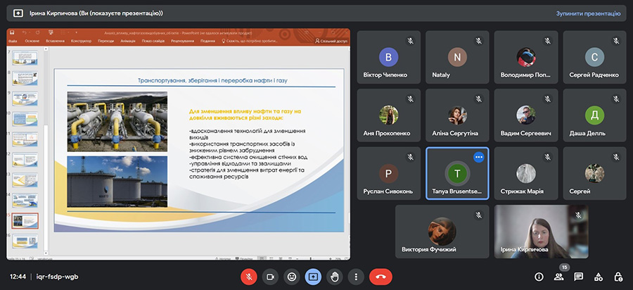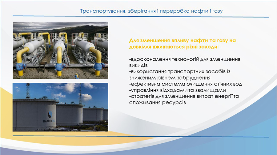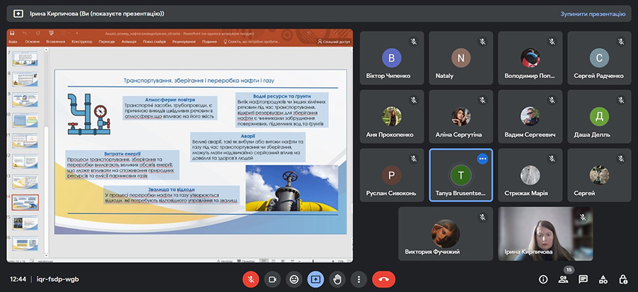 Навколишнє середовище України має навантаження як від власного видобутку, використання та переробки вуглеводнів, так і від значних обсягів транзиту. Під час зустрічі здобувачі дізналися, які заходи необхідно проводити для зменшення негативного впливу на довкілля геолого-розвідувальних робіт, буріння, розглянули екологічні проблеми при експлуатації нафтогазових родовищ.