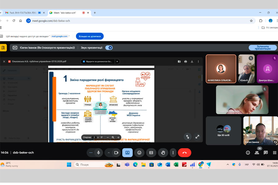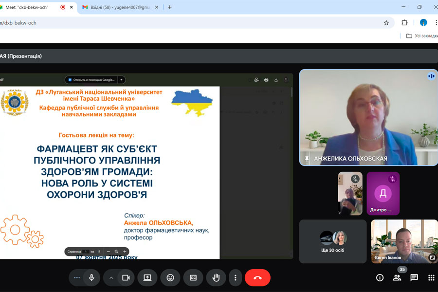07.10.2025 на кафедрі публічної служби й управління навчальними закладами, навчально-наукового інституту публічного управління і післядипломної освіти, ДЗ «Луганський національний університет імені Тараса Шевченка» для здобувачів 1 курсу другого (магістерського) рівня вищої освіти спеціальності D4 «Публічне управління та адміністрування» освітньої програми «Територіальне управління та місцеве самоврядування» у межах обовʼязкового освітнього компоненту «Психологічні аспекти публічного управління» відбулась гостьова лекція на тему «Фармацевт як суб’єкт публічного управління здоров’ям громади: нова роль у системі охорони здоров’я».