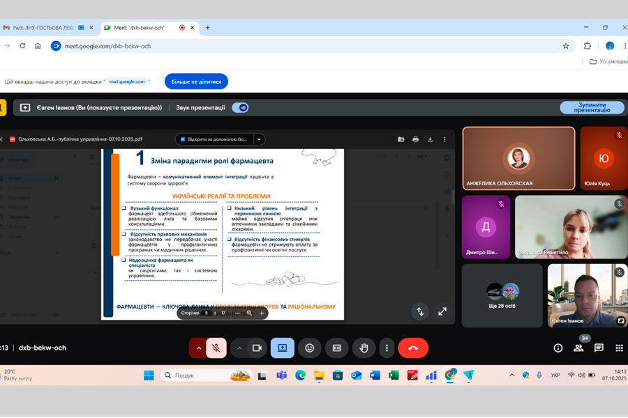 Під час лекції професорка Ольховська розкрила питання трансформації ролі фармацевта у сучасному суспільстві, зокрема як активного учасника процесів публічного управління у сфері охорони здоров’я. Під час заходу акцентовано увагу на важливості розвитку партнерства між медичними та управлінськими структурами, а також на психологічних аспектах комунікації фармацевта з громадою і пацієнтами.