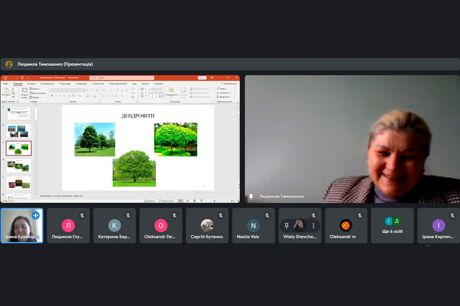 Лектором виступила Людмила ТИМОШЕНКО, кандидат сільськогосподарських наук, старший науковий співробітник лабораторії агроекологічного лісівництва відділу лісових екосистем та агролісомеліорації Інституту агроекології та природокористування НААН України. Під час презентації пані Людмила представила результати досліджень, спрямованих на вивчення видового різноманіття деревних та чагарникових рослин у міському середовищі, зокрема в місті Лубни. Пані Людмила розкрила ключові аспекти впливу природних та антропогенних чинників на стан дендрофітів у містах. Вона підкреслила, що кліматичні умови, ґрунтові та гідрологічні фактори, а також забруднення повітря, урбанізація та рекреаційне навантаження значно впливають на життєздатність та розвиток міських зелених насаджень.