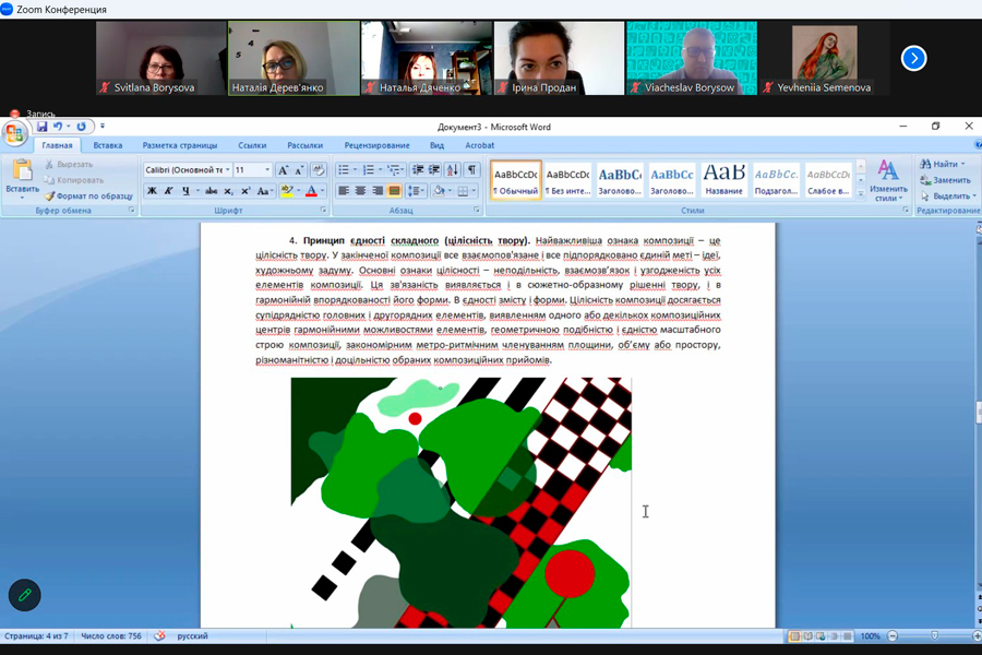 Гостьова лекція з елементами практичної роботи була проведена доценткою кафедри дизайну Хортицької національної навчально-реабілітаційної академії Наталією Дерев’янко на тему «Формальна композиція. Принципи композиції». Під час лекційного заняття було обговорено як «класичні» види формальної композиції, так і ті зразки композицій, що викликають дискусію. Особлива увага приверталася до формальних ознак композиції: цілісність, підпорядкованість другорядного головному, рівновага тощо.