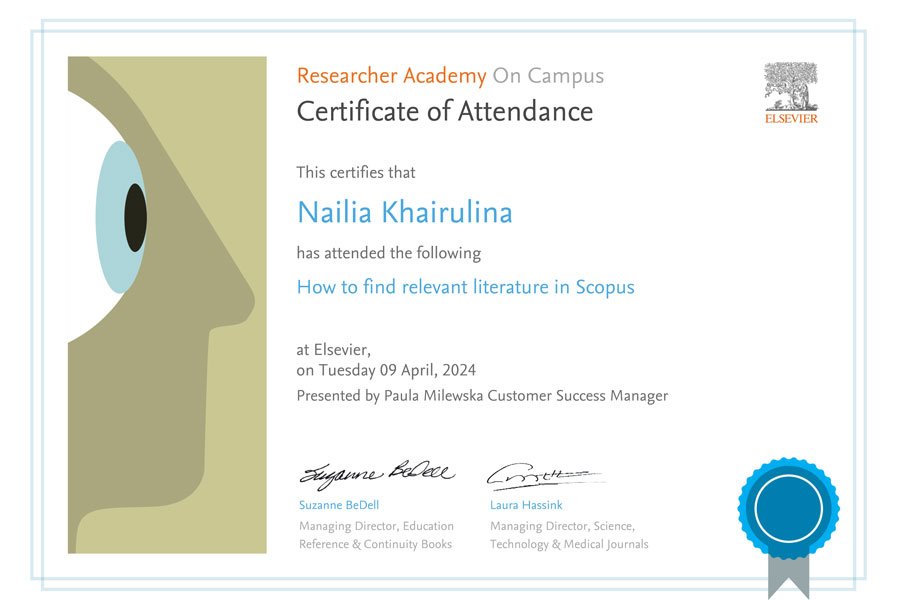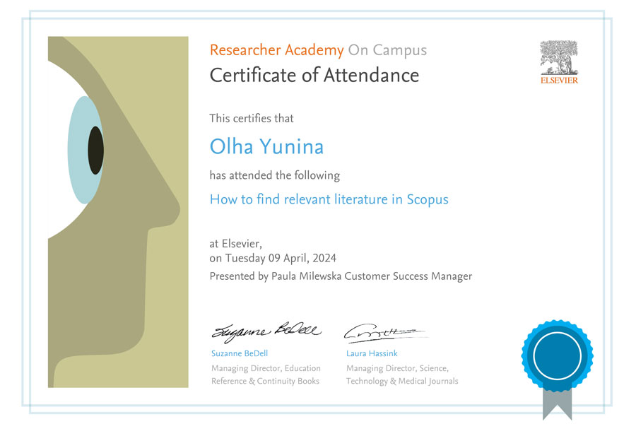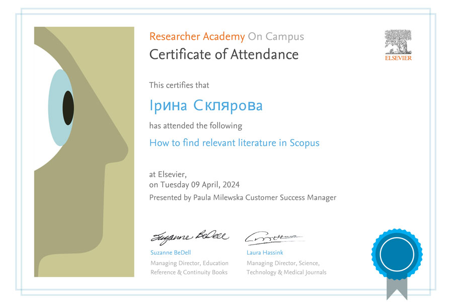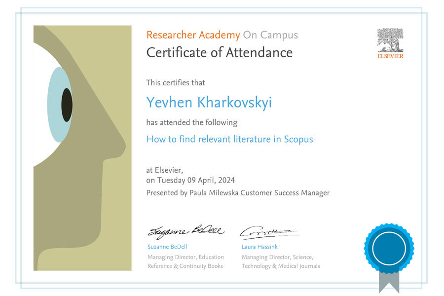 9 квітня 2024 року Хайруліна Н. Ф., Юніна О. Є., Харковський Є. М. та Склярова І. В. взяли участь у вебінарі “How to find relevant literature in Scopus”, який дав цінні поради та інструкції стосовно використання Scopus, однієї з найбільш авторитетних баз даних наукової літератури та наукових цитувань.