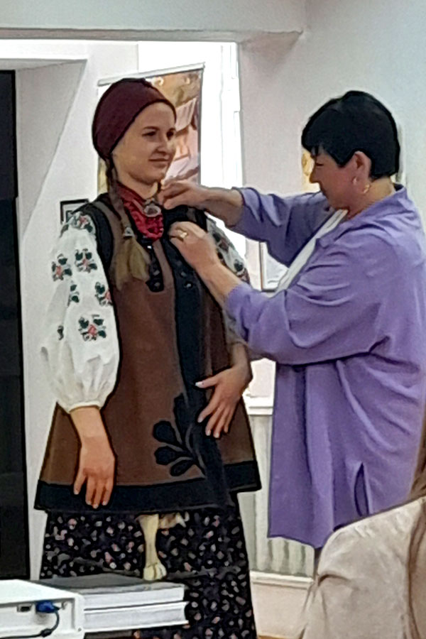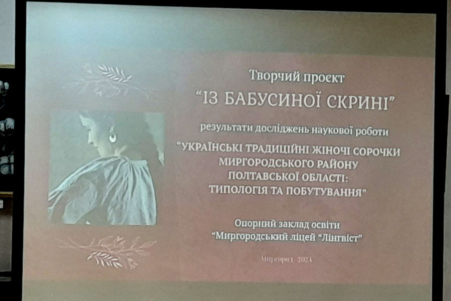 Учениці гуртка “Традиції миргородської вишивки” (Анастасія Володько, Ярослава Микитенко, Дарина Мовчан) провели кропітку, ретельну і таку важливу роботу для дослідження та збереження автентичної, історочної культури українського народу через жіночі вишивані сорочки. Зразки збиралася з усіх куточків України. Кожна сорочка має свою неповторну і цікаву історію. Кожен елемент вишивки, крою, мережки відфотографовувся мікрозйомкою аби передати всю красу нашої культурної спадщини та збергти її для наступних поколінь. Родзинкою заходу стало вдягання дівчини в традиційний жіночий одяг (модель Анна Бердак).