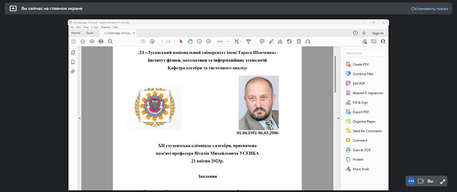 21 квітня в рамках днів науки за допомогою популярного сервісу онлайн-комунікацій GoogleMeetв НН ІФМІТ пройшла алгебраїчна олімпіада, присвячена пам’яті видатного українського алгебраїста, доктора фізико-математичних наук, професора Віталія Михайловича Усенка. Вчений працював у нашому університеті у період 2001–2006 рр. та зробив значний вклад у розвиток алгебри в Луганській області та Україні в цілому. Зокрема, за ініціативою професора В.М. Усенка та при підтримці керівництва університету було відкрито аспірантуру з математики та організовано відомий на сьогодні в світі математичний журнал «Algebra and Discrete Mathematics», який з 2012 року включений в міжнародну наукометричну базу даних Scopus, а з 2016 – в базу даних Emerging Sources Citation Index (Web of Science). До речі, в минулому році журнал «Algebra and Discrete Mathematics» відзначив вже своє 20-річчя, а тиждень тому відбувся разовий захист з математики випускниці згаданої аспірантури http://luguniv.edu.ua/?p=98182.