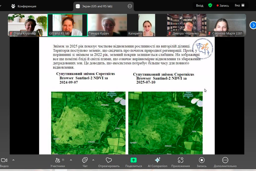Крім того, підвищено кваліфікацію шляхом проходження курсів з використання ДЗЗ для аналізу наслідків війни для довкілля. На основі цих даних проведено аналіз наслідків пожеж в Луганській області, на об’єктах природно-заповідного фонду по лінії зіткнення, взято участь в конференціях та підготовлено наукові публікації: «Аналіз масштабних пожеж у Луганській області: екологічні наслідки та супутниковий моніторинг» (16-та Міжнародна науково-технічна конференція «Проблеми екології та енергозбереження» 23–24 жовтня 2025 р.), «Супутниковий моніторинг наслідків пожеж у Луганській області» та «Вплив військових дій на природні заповідні території на півдні та сході України у 2023–2025 роках» (VI Міжнародна науково-практична конференція «Природничі науки: проекти, дослідження, перспективи», м. Миргород), Моніторинг наслідків пожеж для природно-заповідних територій прифронтових регіонів України (XXVIII Всеукраїнська щорічна науково-практична конференція «Могилянські читання–2025: досвід та тенденції розвитку суспільства в Україні: глобальний, національний та регіональний аспекти»).