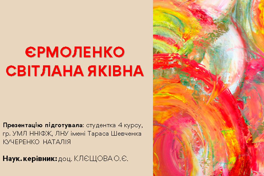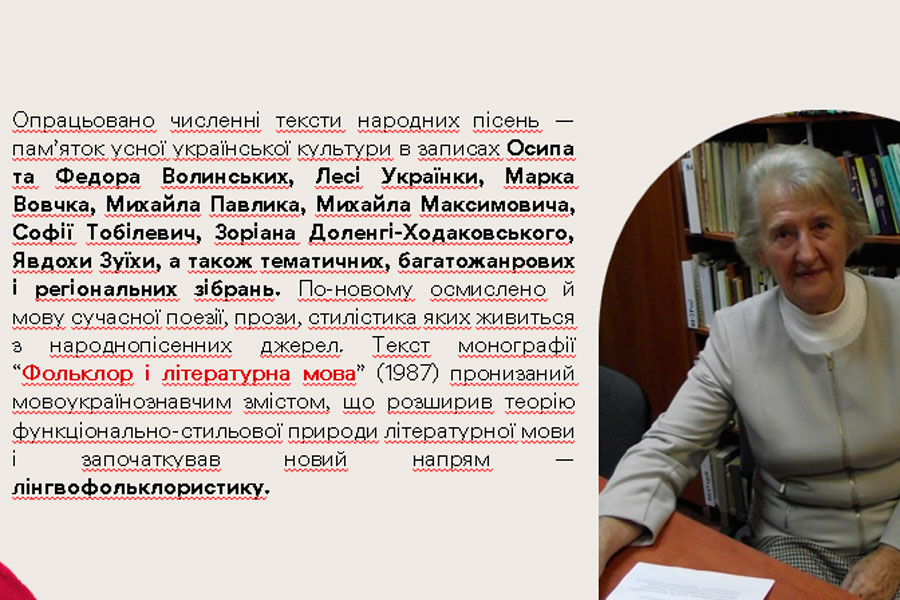 Здобувачка освіти 4 курсу ОП «Середня освіта (Українська мова і література)» Кучеренко Наталія підготувала презентацію про академіка Національної академії наук України Світлану Яківну Єрмоленко, доктора філологічних наук, професора, багаторічну завідувачку відділу стилістики, культури мови та соціолінгвістики. Світлана Яківна – відомий учений у галузі української лінгвостилістики, стилістики слов’янських мов, синтаксису, теорії літературної мови, яка заклала теоретичні основи лінгвофольклористики, напрями сучасних студій із культури мови, обґрунтувала концептуальний зміст понять «рідна мова», «літературна мова», «часова і просторова глибина мовної норми», «мовно-естетичні знаки національної культури». Сформулювала ідею системної природи стилістичного значення синтаксичних одиниць, структурно-семантичного варіювання простих і складних речень у різновидах мови.