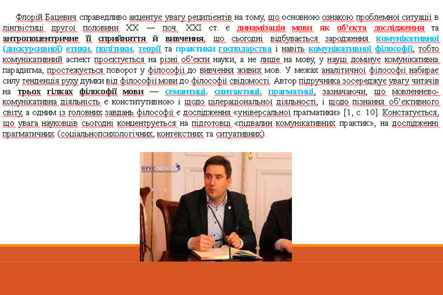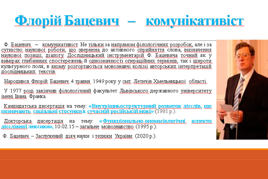 Здобувач освіти 2 курсу ОП «Середня освіта (Українська мова і література)» Булдаков Микита підготував презентацію про львівського вченого у галузі комунікативної лінгвістики і філософії мови – Флорія Сергійовича Бацевича – професора, доктора філологічних наук, завідувача кафедри загального мовознавства Львівського національного університету імені Івана Франка, заслуженого професора Львівського університету. Флорій Бацевич – комунікативіст не тільки за напрямом філологічних розробок, але і за сутністю наукової роботи, що звернена до активного сприйняття слова, визначення наукової позиції, діалогу. Дослідницький інструментарій Ф. Бацевича точний як у вимірах глибинних спостережень й однозначності операційних термінів, так і широти культурного поля, у якому розгортаються мовознавчі колізії авторських інтерпретацій дослідницьких текстів. Основними рисами сучасної лінгвістики Ф. Бацевич вважає антропоцентризм, функціоналізм та комунікативність.