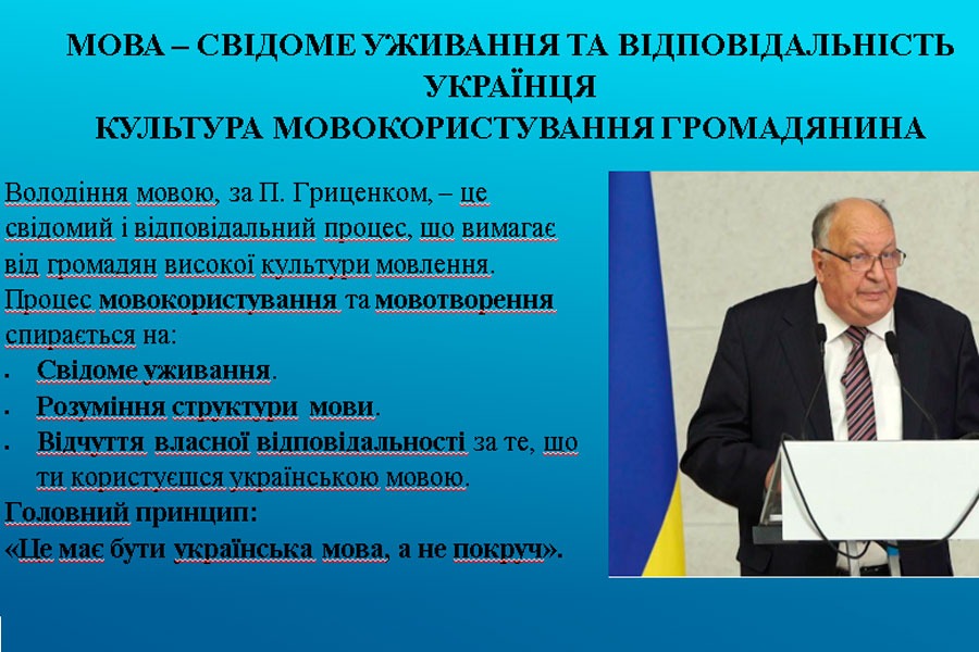Здобувачка освіти 4 курсу ОП «Середня освіта (Українська мова і література)» Каніщева Юлія (наук. керівник – проф. Глуховцева К.Д.) підготувала презентацію «Самодостатність громадянина України розпочинається з самодостатньої сильної розвиненої мови», присвячену Павлові Юхимовичу Гриценку – багаторічному очільникові Інституту української мови НАН України, невтомному захисникові рідної мови, живій легенді українського мовознавства, голос якого має чути кожен українець. Презентацію було створено з нагоди 75-річчя вченого.