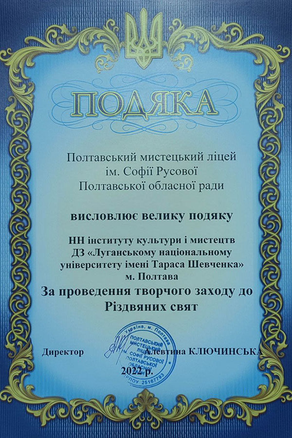 21 грудня навчально-науковий інститут культури і мистецтв завітав до Полтавського мистецького ліцею імені Софії Русової з концертом до Різдвяних свят. На початку концерту директорка НН ІКМ Ірина Продан звернулася із привітальним словом до ліцеїстів, розповіла про спеціальності, які є в навчально-науковому інституті культури і мистецтв, подякувала директору ліцею за запрошення і можливість провести цей захід в стінах Полтавського мистецького ліцею.