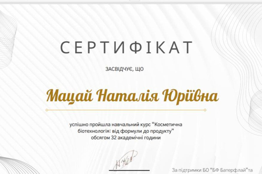 Упродовж двох тижнів Наталія МАЦАЙ, директор НН Інституту природничих і аграрних наук проходила навчання для фахівців біологів, хіміків, медиків та фармакологів з курсу "Косметична біотехнологія: від формули до продукту" який відбувався в партнерстві з Tech StartUp School за ініціативою кар’єрного та бізнес-хабу ВОНА.