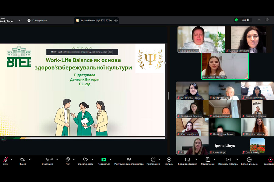 Вікторія Денесяк, здобувачка першого (бакалаврського) рівня вищої освіти за спеціальністю 053 «Психологія» Вінницького торговельно-економічного інституту Державного торговельно-економічного університету, розкрила тему «Баланс між роботою і життям (work-life balance) як елемент здоров’язбережувальної культури».