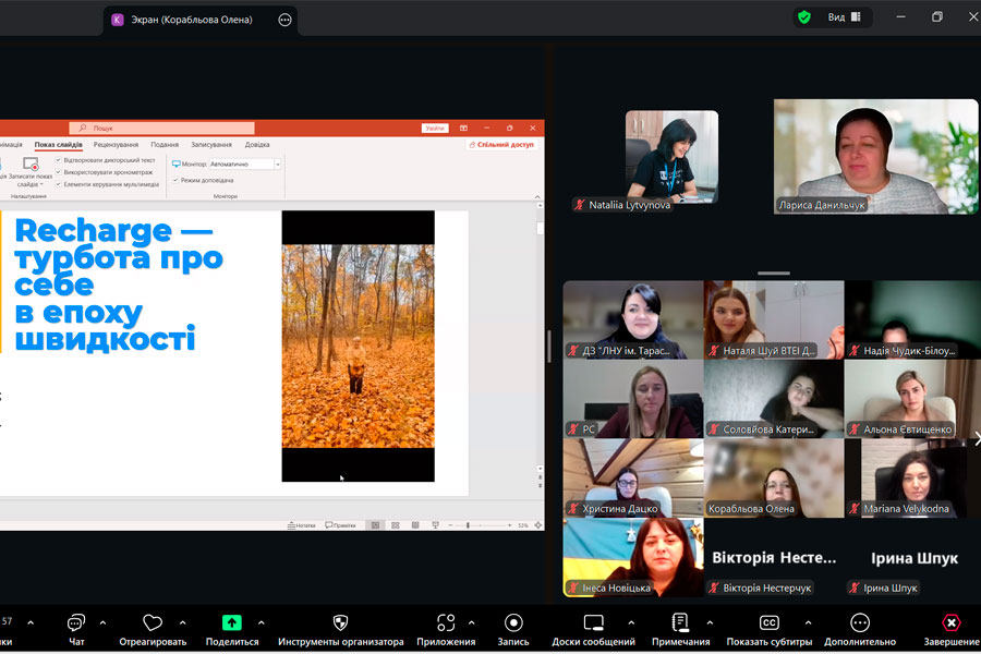 Наталія Литвинова, кандидат педагогічних наук, доцент кафедри соціальної педагогіки ДЗ «Луганський національний університет імені Тараса Шевченка», поділилася практичними порадами у виступі «Самодопомога та самовідновлення в умовах кризових ситуацій».