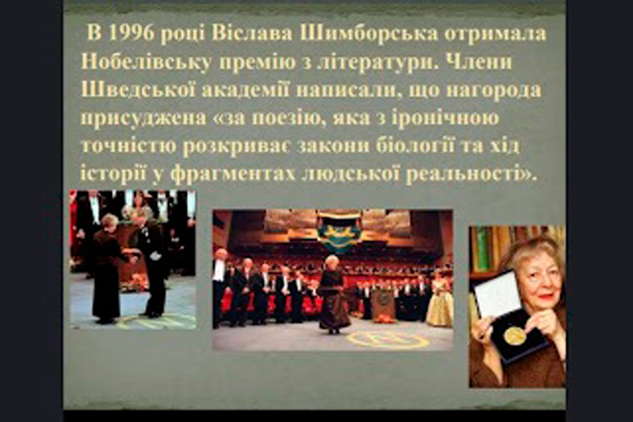 Полоністка розкрила особливості рецепції Нобелівськім комітетом польських письменників. Генрік Сенкевич отримав премію за історичний роман «Потоп», який репрезентував світові видатний епічний талант митця. Повість «Селяни» про життя людей в невеличкому селище поблизу Лодзі принесла Владиславу Реймонту довгоочікувану нагороду, але письменник був важкохворий і не зміг особисто отримати премію, через рік він помер. Третім польським лауреатом Нобелівської премії став поет-емігрант Чеслав Мілош, котрий втік від утисків влади до США. На думку комітету, його поезії вирізняються сміливістю, глибоким розумінням внутрішнього світу людини. Поетеса Віслава Шимборська, котра стала лауреаткою у 1996 році, вирізнялася скромністю і першою її реакцією на звістку про присудження премії були слова «О, Господи, чому я?». Юлія Скребньова прочитала уривок із поезії авторки польською мовою і навела власний переклад твору: