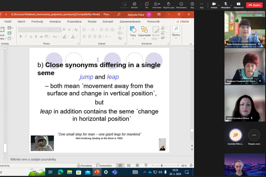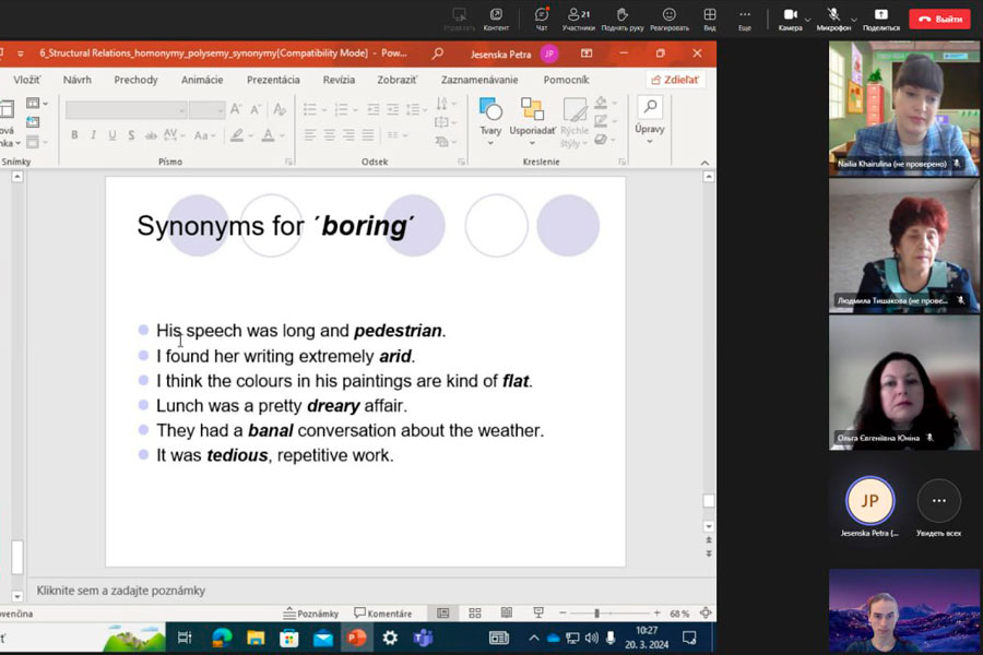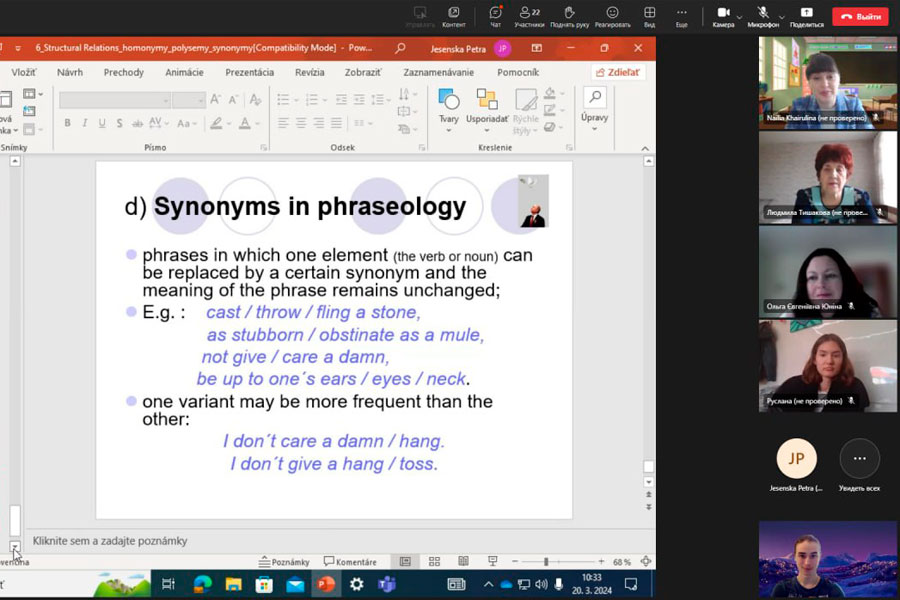 У рамках міжнародної співпраці кафедри романо-германської філології (ННІФіЖ) з кафедрою англійської мови та американістики (Faculty of Art, Matej Bel University, Banska Bystrica) протягом березня-квітня для здобувачів першого (бакалаврського) та другого (магістерського) рівнів вищої освіти лектор пані Петра Єсенська (Petra Jesenská), доктор філософії, провела захоплюючу серію лекцій з лексикології англійської мови.