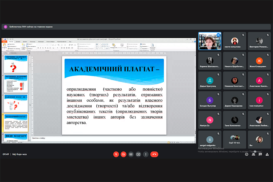 Лекцію-бесіду провела Тетяна Улановська, завуч Школи академічної доброчесності, бібліограф І категорії бібліотеки, яка ознайомила здобувачів освіти з правилами цитування, оформлення списку використаної літератури, оригінальністю тексту, плагіату та шляхами його уникнення. А також було зосереджено увагу на дотримання правил академічної доброчесності та ознайомлено з основними видами її порушення під час написання курсових робіт.