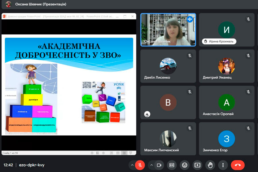 Оксана Володимирівна ознайомила здобувачів вищої освіти з нормативними актами та документами, що регулюють питання дотримання принципів академічної доброчесності, а також з основними видами порушення академічної доброчесності, правилами цитування та оформлення списку використаної літератури.