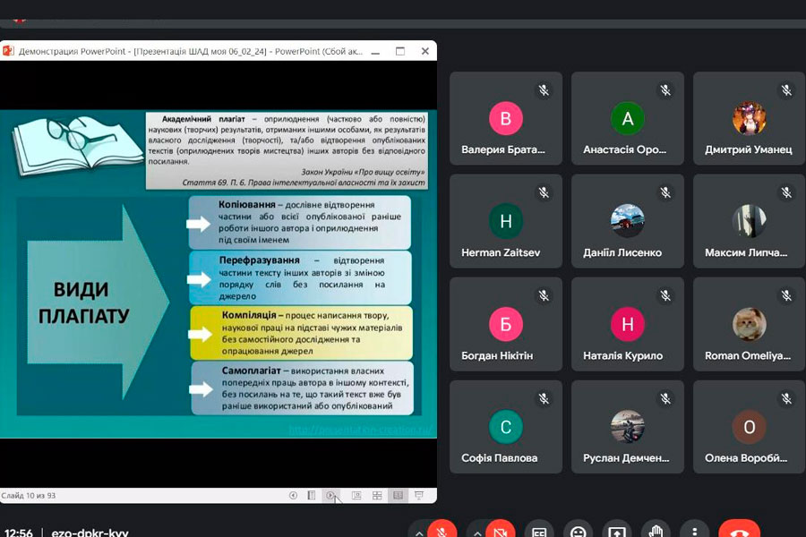Учасники семінару дізналися більше про різницю між компіляцією та плагіатом, як правильно оформлювати цитування та списки літератури, про порушення авторського права та про програми антиплагіату. Отримані знання допоможуть уникнути неприємних ситуацій та помилок у навчанні.