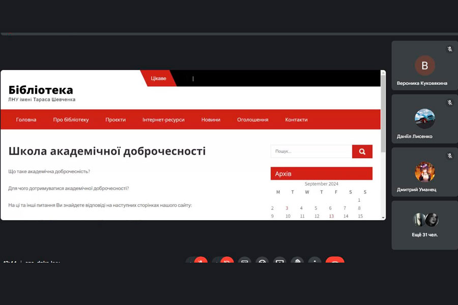 Лекцію провела Шевчик Оксана Володимирівна – провідний бібліотекар ДЗ «ЛНУ імені Тараса Шевченка». Під час лекції було проаналізовано основні вимоги Положення про академічну доброчесність учасників освітнього процесу ДЗ «ЛНУ імені Тараса Шевченка», яке доступне широкому загалу користувачів на сайті університету. Відповідно до нього передбачено вимоги дотримання академічної доброчесності науково-педагогічними працівниками та здобувачами вищої освіти.