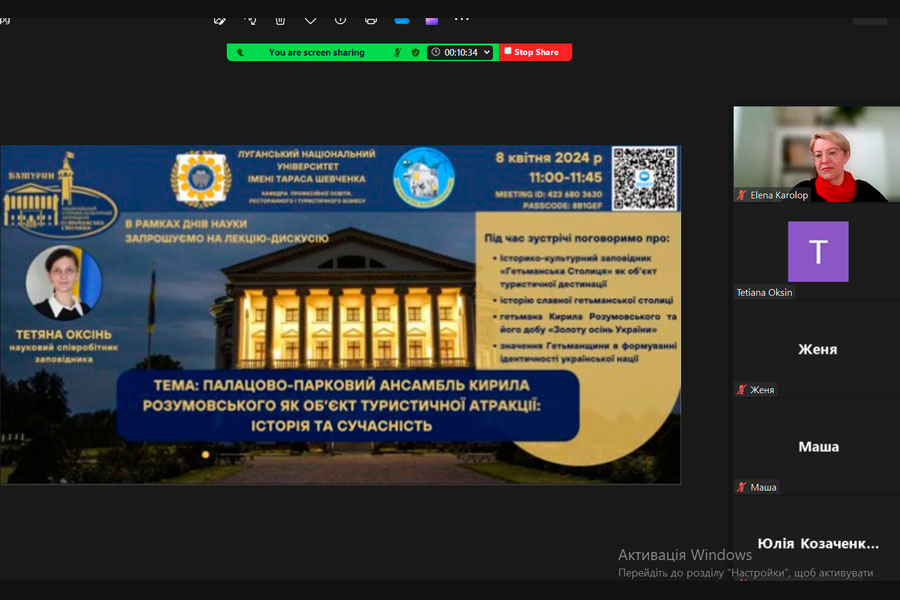 В рамках Днів науки на кафедрі професійної підготовки, ресторанного і туристичного бізнесу 8 квітня 2024 р. відбулася он-лайн лекція – дискусія на тему «Палацово-парковий ансамбль Кирила Розумовського як об’єкт туристичної атракції: історія та сучасність».