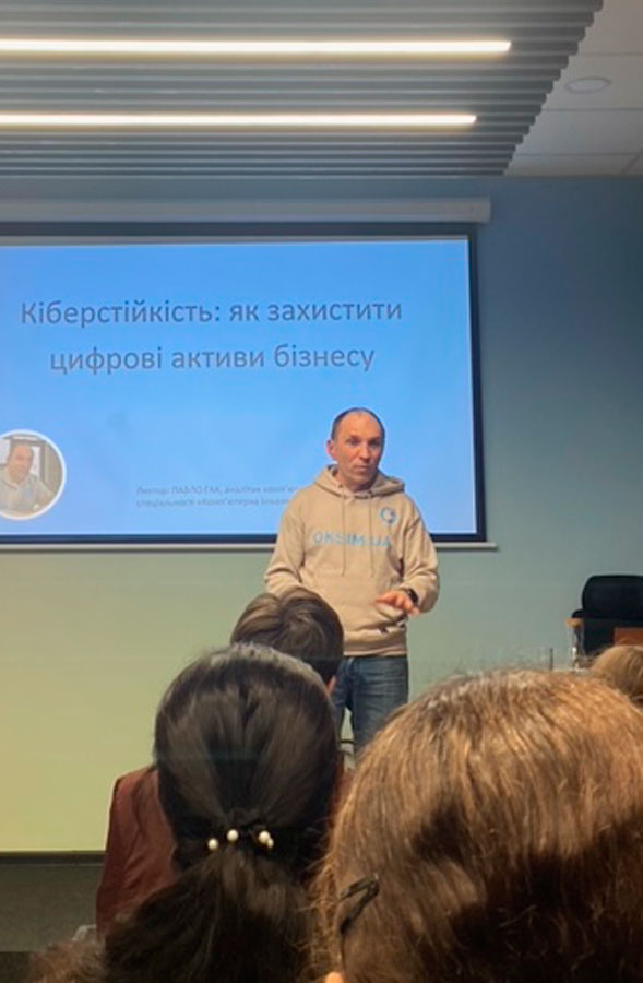 У сучасному цифровому світі, де технології пронизують усі сфери нашого життя, питання кібербезпеки стає надзвичайно актуальним. Щоб розуміти загрози, з якими ми можемо зіткнутися в онлайн-середовищі, і зберігати свою власність та дані в безпеці, необхідно мати відповідні знання. Тому у межах плану з соціально-гуманітарної роботи здобувачі освіти і викладачі кафедри східної філології і перекладу відвідали лекцію «Кіберстійкість: як захистити цифрові активи в бізнесі», яку провів комп᾽ютерний аналітик Павло Гак. Вона включала в себе розгляд загальних понять, таких як захист від хакерських атак, безпека мереж та захист даних. Студенти мали змогу зазирнути в глибини різних видів кіберзагроз, що допомогло їм краще зрозуміти складність проблеми та виявити потенційні вразливості. Лекція надала студентам цінні знання, навички та мотивацію для подальшого вивчення та діяльності в цій важливій для майбутніх перекладачів області. Такі ініціативи є важливим елементом формування компетентних та відповідальних громадян, які здатні захищати себе та своє суспільство в цифровому віці.