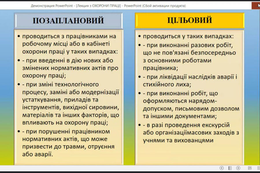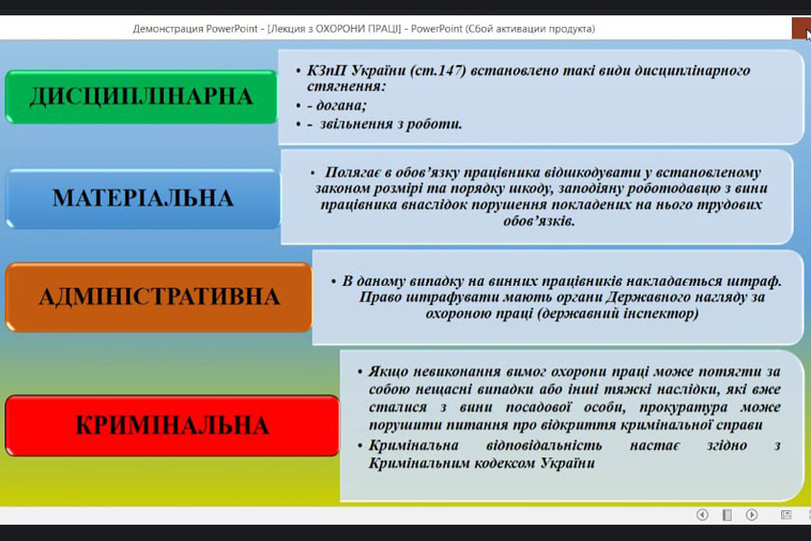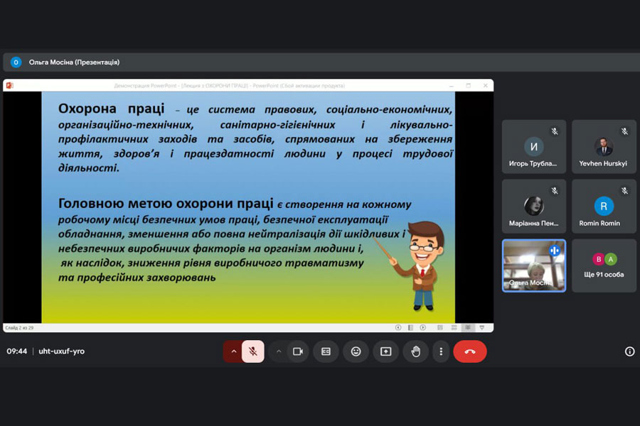 Мета лекції полягала у ознайомлені здобувачів освіти з основними нормативно-правовими актами, які регулюють сферу охорони праці в Україні. Ольга Йосипівна висвітлила актуальні вимоги законодавства та нормативи і наголосила на основних нюансах, які варто враховувати при організації роботи та освітньої діяльності.
