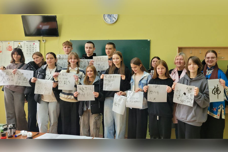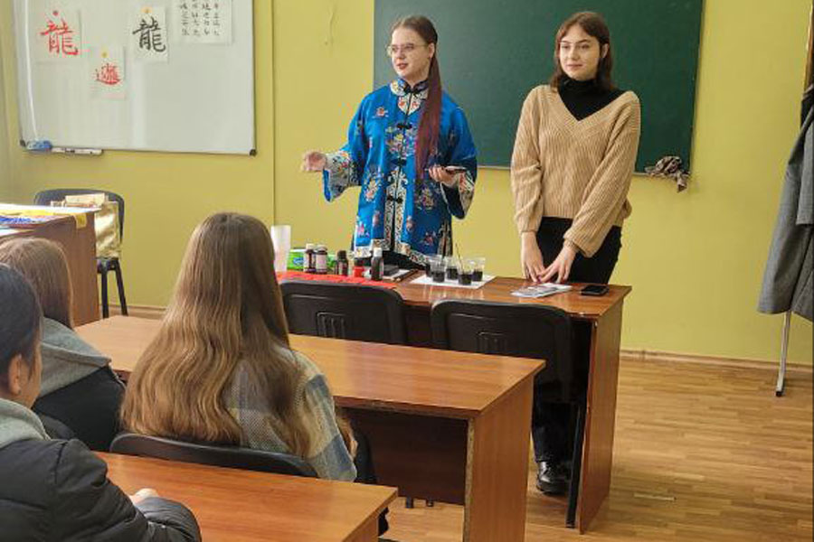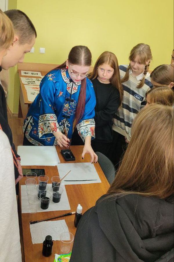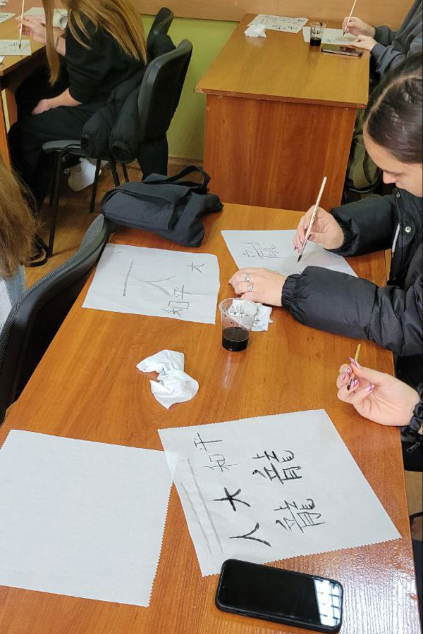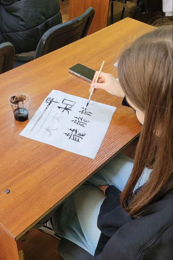 Панувала творча атмосфера, усі заглибились у сповнений таємниць світ Сходу. Студентки 3 курсу спеціальності «Філологія. Східні мови та літератури (переклад включно), перша – китайська» Софія Недогибченко і Дар’я Корабель поділились з присутніми отриманими знаннями щодо символіки й таємниць написання ієрогліфів. Софія принесла для демонстрації власні роботи, які віддзеркалюють її каліграфічну майстерність, розповіла про важливі аспекти швидкого опанування написання складних ієрогліфів, поділилась секретами асоціативного запам’ятовування деяких із них. Дізнались студенти і про особливості використання матеріалів для роботи, наприклад, про те, що червоний папір використовують переважно для святкових подій і оберегів.