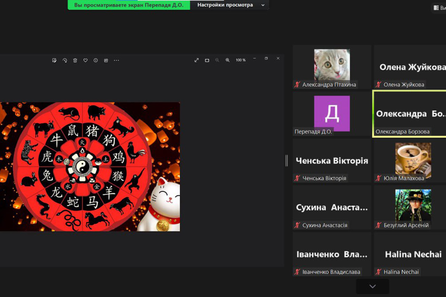 Перепадя Дар’я Олександрівна поділилася відомостями щодо 12 тварин китайського гороскопу, ознайомила із однією з легенд про їх походження. Учасники обговорили риси, притаманні тваринам, що стали символами дванадцятирічного циклу.