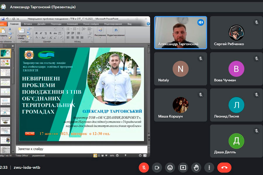 Здобувачі та викладачі факультету природничих наук відвідали гостьову лекцію Олександра Таргонського, директора ТОВ «Об’єднання Добробут», аспіранта Науково-дослідної установи «Український науково-дослідний інститут екологічних проблем». Це була третя лекція з циклу запланованих гостьових лекцій від стейкхолдера освітньої програми Екологія – Науково-дослідної установи «Український науково-дослідний інститут екологічних проблем» (УКРНДІЕП). Модератором зустрічі виступила гарант освітньої програми Екологія магістерського рівня Ірина КИРПИЧОВА, доцент кафедри садово-паркового господарства та екології.