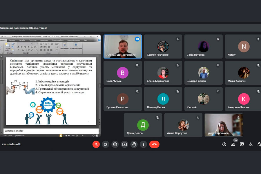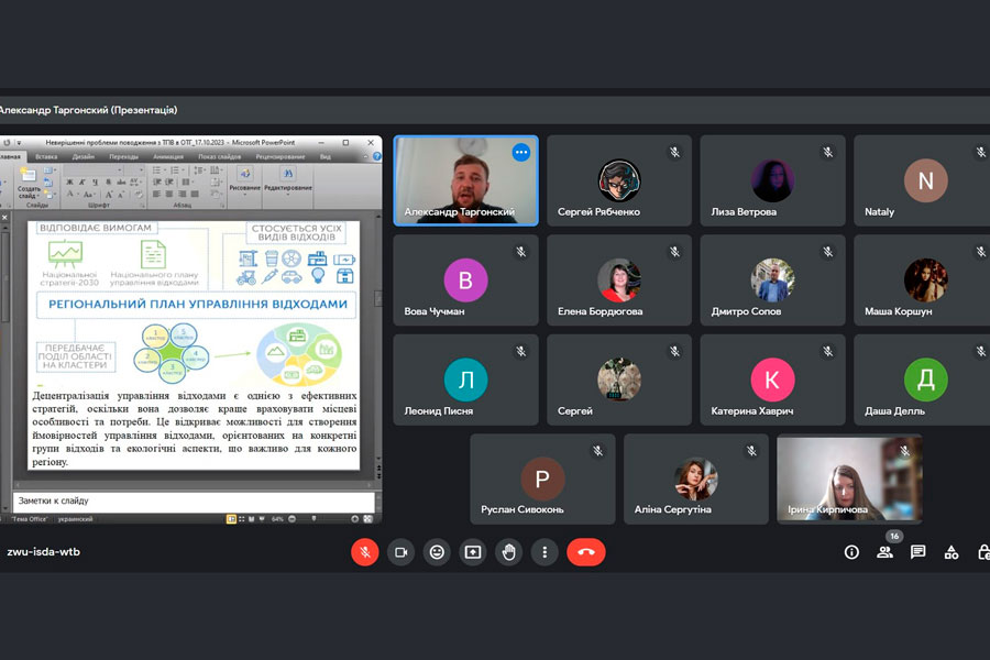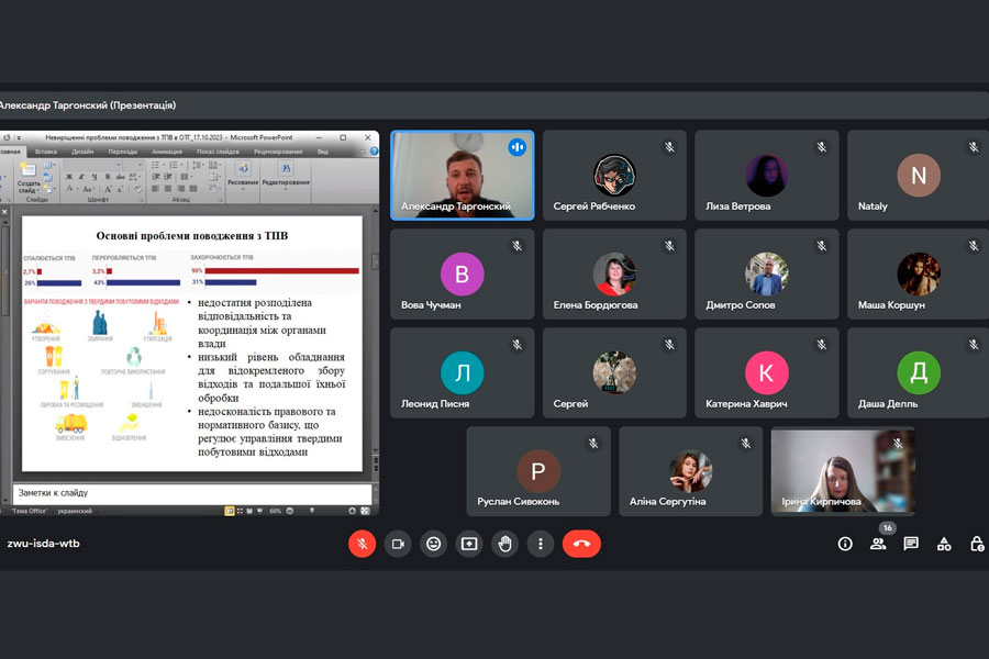 Онлайн лекція відбулася 17 жовтня та була присвячена акутальній темі: «Невирішені проблеми поводження з ТПВ в об’єднаних територіальних громадах». Під час лекції обговорювалися важливі питання, які стосуються основних проблем поводження з відходами: недостатня розподілена відповідальність та координація між органами влади; низький рівень обладнання для відокремленого збору відходів та подальшої їхньої обробки; недосконалість правового та нормативного базису, що регулює управління твердими побутовими відходами. Управління та відповідальне поводження з відходами — це комплексний підхід, який виходить за межі простого збору та утилізації відходів. Він передбачає їхнє подальше перероблення та використання з метою зменшення негативного впливу на навколишнє середовище. Це важлива складова сталого розвитку, оскільки дозволяє зберігати природні ресурси та зменшувати негативний екологічний вплив.