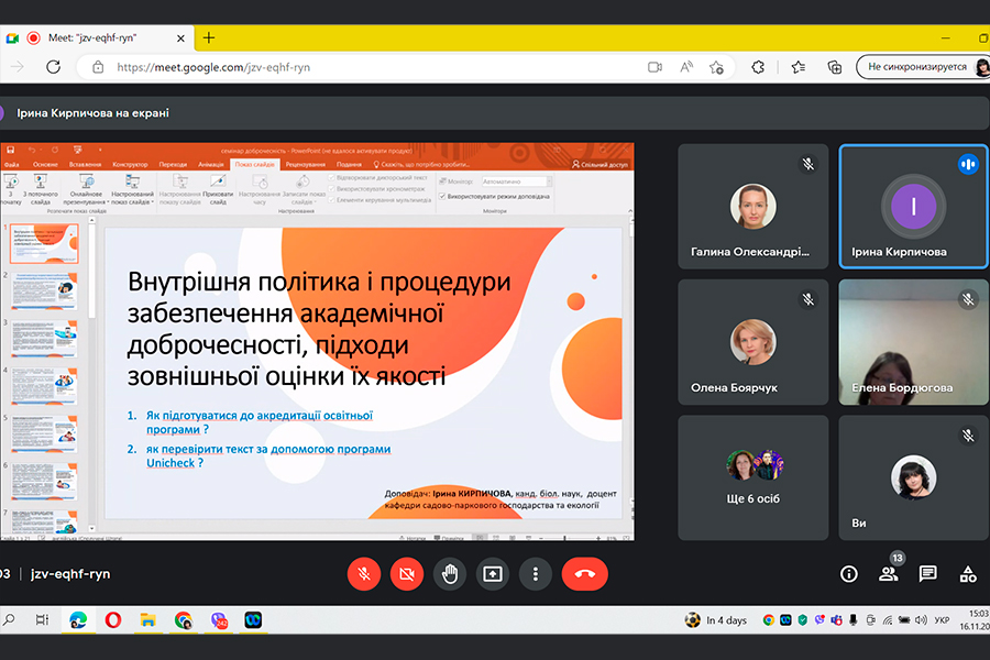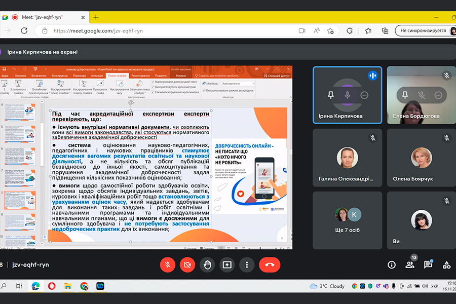 16 листопаду 2022 р. науково-педагогічні працівники та аспіранти кафедр факультету природничих наук прийняли участь у роботі семінару «Внутрішня політика і процедури забезпечення академічної доброчесності, підходи зовнішньої оцінки їх якості». Спікером та модератором зустрічі була Ірина Кирпичова, доцент кафедри садово-паркового господарства та екології, кандидат біологічних наук. Під час семінару було розглянуто питання вимог до нормативного забезпечення академічної доброчесності у вищій освіті, критерії оцінювання академічної доброчесності під час акредитації освітніх програм та продемонстровано практичний кейс роботи за допомогою інформаційної онлайн системи виявлення текстових збігів unicheck.