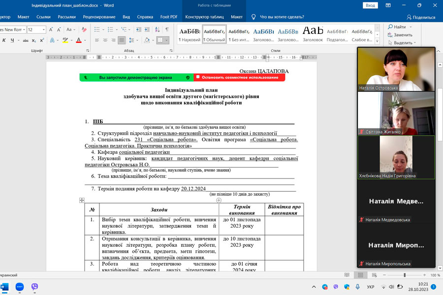 Під час роботи зі здобувачами освіти другого (магістерського) рівня освіти, магістранти 1 року навчання мали можливість ознайомитись з графіком освітнього процесу та індивідуальним навчальним планом, з особливостями роботи на освітньому порталі, з основами академічної доброчесності та особливостями перевірки робіт на плагіат, з планом проведення науково-практичних конференцій, круглих столів та вебінарів на кафедрі, а також взяли участь у настановній конференції з науково-дослідної практики.