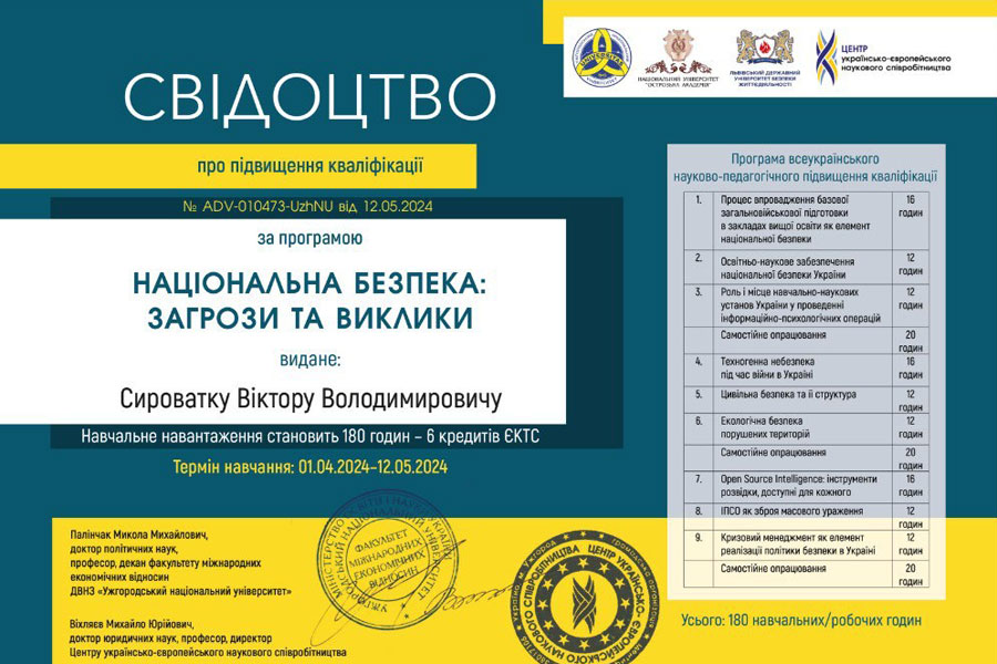 Сьогодні спостерігається тенденція зростання викликів міжнародній стабільності та національній безпеці України, яка зумовлена формуванням багатополюсного світу. Ця обставина має бути врахована при розробці та впровадженні державної політики національної безпеки як на середньострокову, так і довгострокову перспективу. Тому, викладачі та аспіранти кафедри політології і міжнародних відносин Навчально-наукового інституту соціальних і гуманітарних наук Луганського національного університету імені Тараса Шевченка долучилися до всеукраїнського науково-педагогічного підвищення кваліфікації «Національна безпека: загрози та виклики» яке успішно завершили.