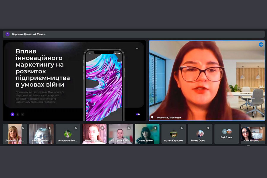 Даолатзай Вероніка, здобувачка вищої освіти 2 курсу освітньої програми «Маркетингґ», тема доповіді: «Вплив інноваційного маркетингу на розвиток підприємництва в умовах війни в Україні».