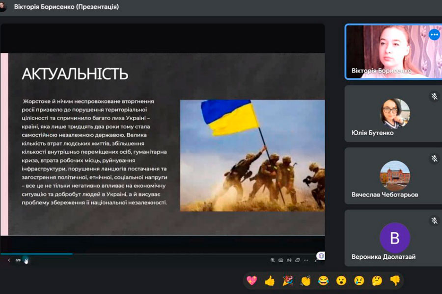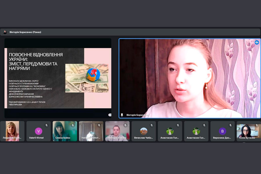 Борисенко Вікторія, здобувачка вищої освіти 1 курсу освітньої програми «Економіка», тема доповіді: «Повоєнне відновлення України: зміст, передумови, напрямки.
