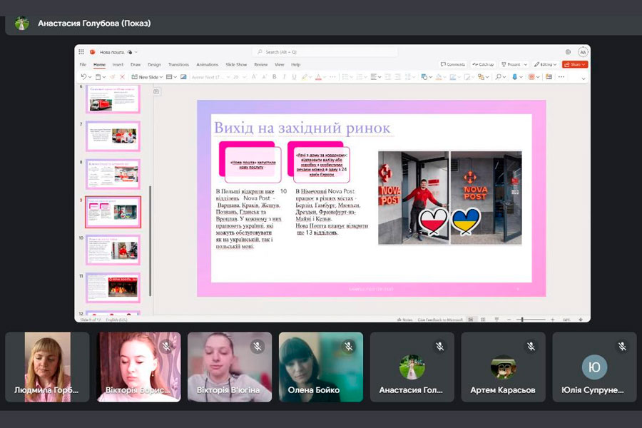 Голубова Анастасія, здобувачка вищої освіти 1 курсу освітньої програми «Економіка», тема доповіді: «Нова пошта під час війни: основні показники діяльності, соціальні ініціативи та вихід на західний ринок».
