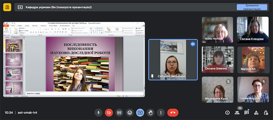 Доцентка кафедри української та зарубіжної літератури Світлана Негодяєва акцентувала увагу учасників семінару на питанні «Послідовність виконання науково-дослідної роботи» й ознайомила з типовими помилками, яких припускаються здобувачі вищої освіти у власних роботах.