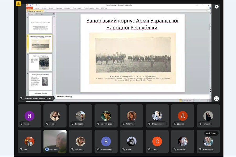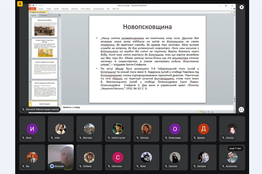 У Луганському національному університеті імені Тараса Шевченка відбулася науково-популярна доповідь доктора історичних наук, завідувача кафедри історії та археології Олександра Набоки присвячена маловідомим сторінкам подій національно-визвольної революції 1917 – 1921 рр., на теренах Луганщини. У центрі уваги доповідача – діяльність українських гайдамацьких загонів (підрозділів Запорізького корпусу армії УНР), які в умовах становлення Української Народної Республіки та загострення військово-політичної ситуації на Сході України відіграли важливу роль у захисті державності у регіоні.