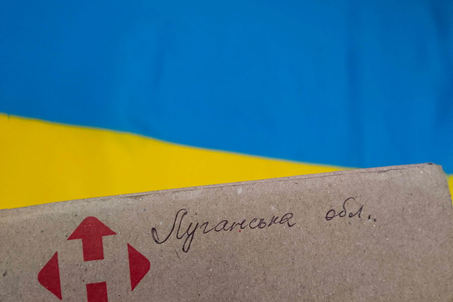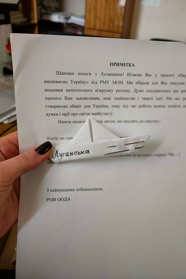 Майстриня із Державного закладу «Луганський національний університет імені Тараса Шевченка» вишиває свою область в евакуації, в місті Полтава, куди у лютому 2022 року тимчасово евакуювався університет. Працюючи далеко від рідного дому, наші НПП не забувають рідну землю і мріють вже в найближчий час повернутися додому.