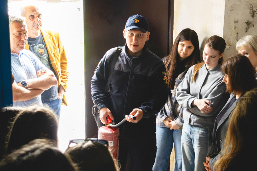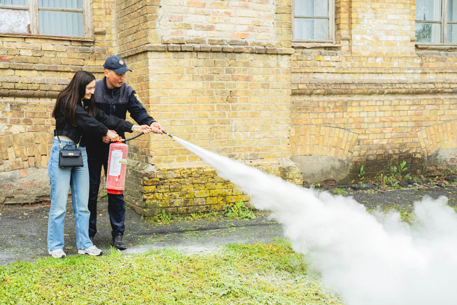 Практична частина навчань проходила на відкритому майданчику біля будівлі університету. До заходу був залучений фахівець Державної служби з надзвичайних ситуацій, який провів інструктаж і демонстрацію щодо правильного користування вогнегасниками. Студенти та співробітники мали змогу самостійно відпрацювати навички гасіння умовної пожежі. Такі заняття формують не лише технічну підготовку, а й психологічну готовність діяти чітко та без паніки в небезпечних ситуаціях.