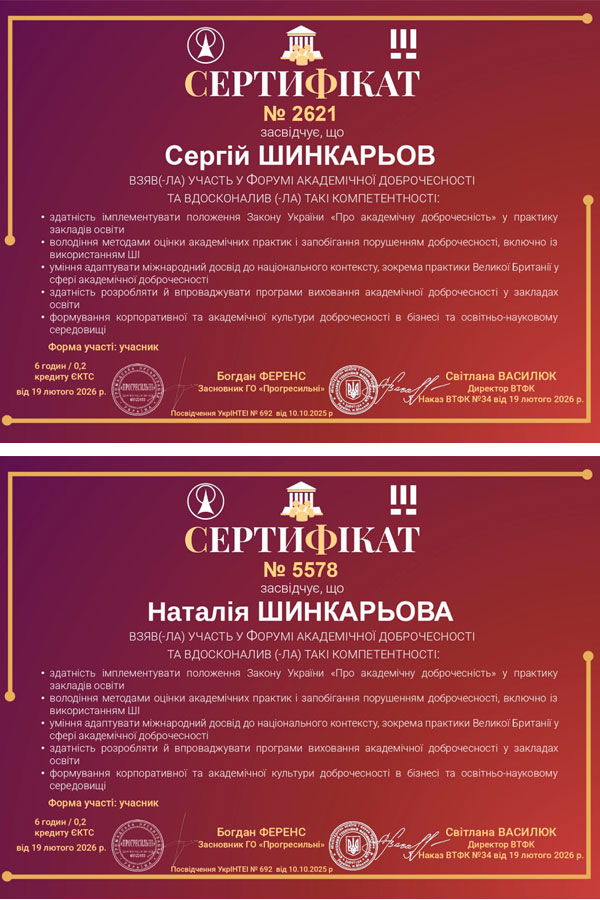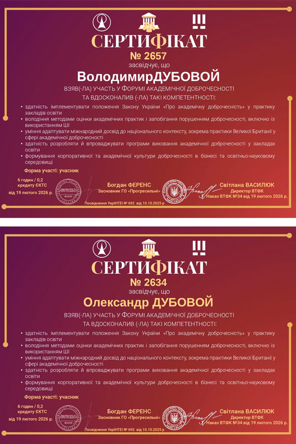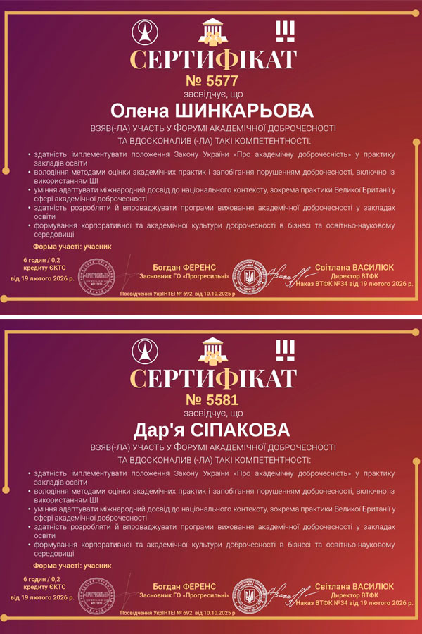 Учасники отримали сертифікати, що підтверджують їхню обізнаність у питаннях академічної доброчесності, етики в освіті, критичного мислення, інформаційної грамотності та відповідального використання технологій.