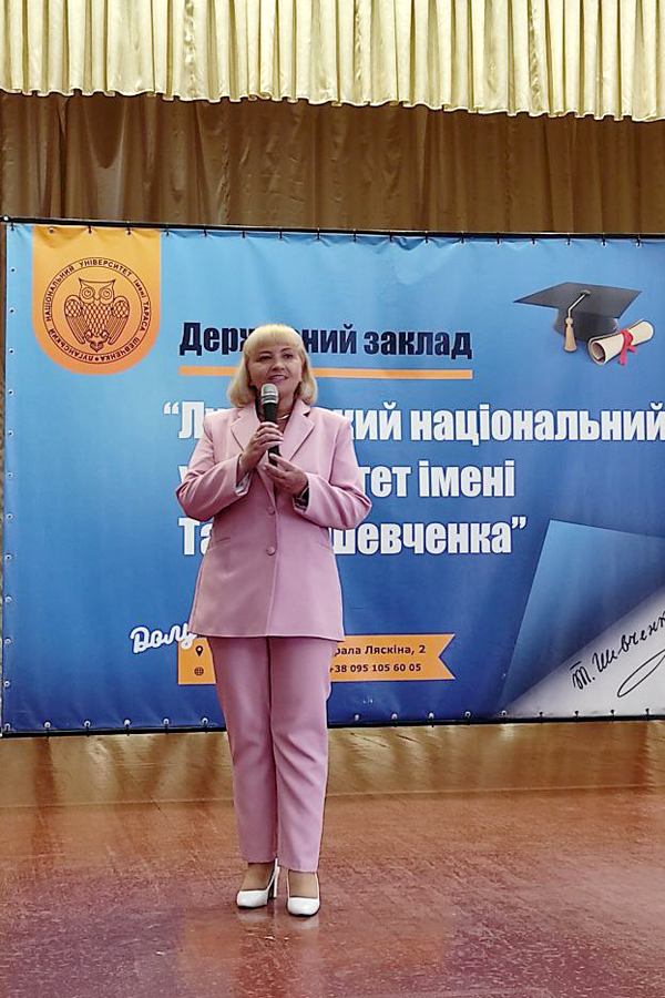 Із найкращими побажаннями до студентів звернулася ректорка Луганського національного університету імені Тараса Шевченка Олена КАРАМАН. Вона коротко розповіла про сам Університет та його структурні підрозділи і спеціальності. Привітала молодь із вступом в один з найславетніших закладів вищої освіти України зі 102-річною історією, який готує фахівців різного профілю.