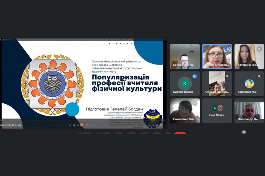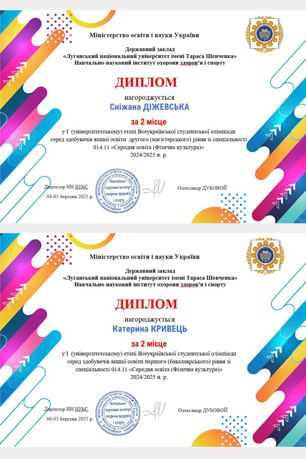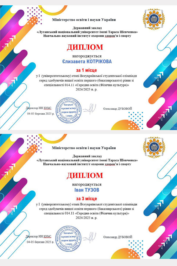 Журі у складі голови – завідувачки кафедри теорії та методики фізичного виховання Олени Отравенко, директора ННІОЗіС Олександра Дубового, доцентів кафедри теорії та методики фізичного виховання Олександра Ливацького, Олени Соколенко, Марини Карпенко, кращого студента ЛНУ-2024 року, випускника другого (магістерського) рівня спеціальності 014 Середня освіта (Фізична культура) Кирила Іванова визначило переможців: серед здобувачів вищої освіти першого (бакалаврського) рівня: І місце – Єлизавета КОТРІКОВА, науковий керівник О.В. Отравенко; ІІ місце – Катерина КРИВЕЦЬ, науковий керівник О.В. Отравенко; ІІІ місце – Іван ТУЗОВ, науковий керівник О.В. Ливацький. На другому (магістерському) рівні місця розподілились наступним чином: І місце – Богдан ТАЛАЛАЙ, науковий керівник О.В. Отравенко; ІІ місце – Сніжана ДІЖЕВСЬКА, науковий керівник О.В. Отравенко; ІІІ місце – Євген ЧЕРЕПАН, науковий керівник М.І. Карпенко. Майже всі здобувачі вищої освіти є членами наукового гуртка «Молодий науковець» кафедри теорії та методики фізичного виховання.