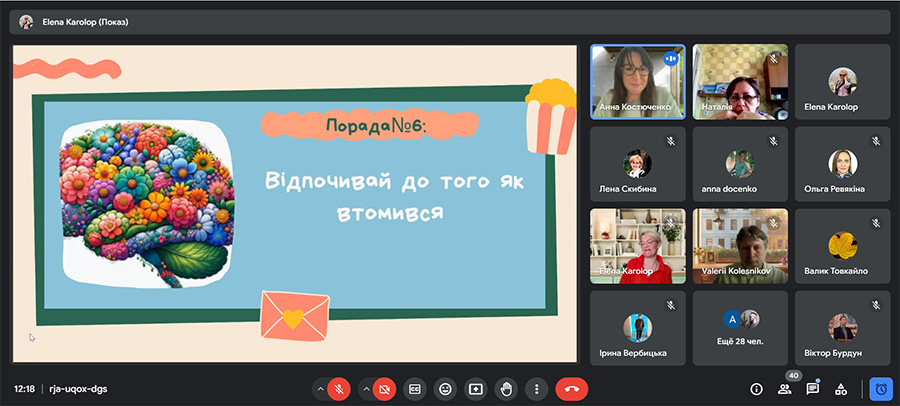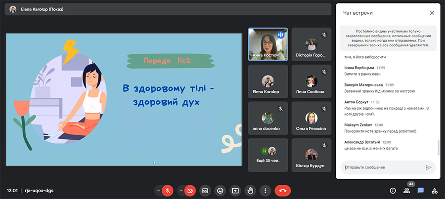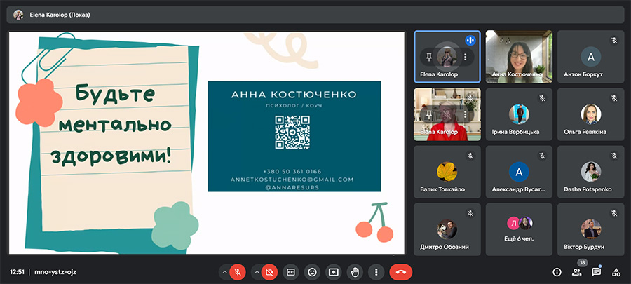 Спікер, психолог-консультант Анна Костюченко, відігравала ключову роль у цьому процесі, надаючи професійні рекомендації та відповідаючи на запитання аудиторії. Вона зосередилася на тому, як підтримувати психоемоційний стан у сучасних умовах, особливо важливих в контексті війни та соціальних викликів. Її поради охоплювали широкий спектр практик, від простих дихальних вправ до складних стратегій саморегуляції.